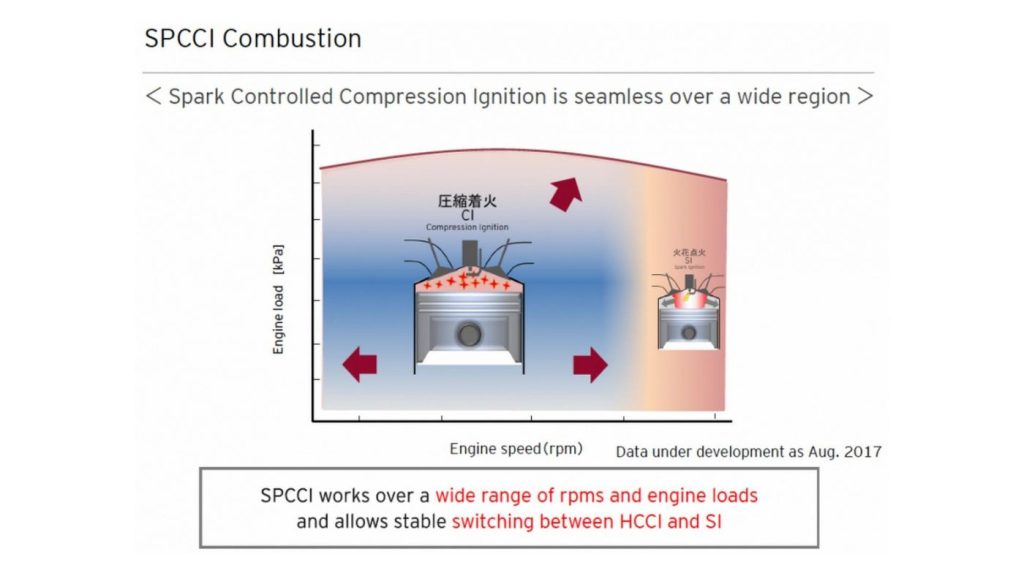 Para chegar a esse resultado, a solução encontrada pela Mazda chama-se HCCI (Homogeneous Charge Compression Ignition) que significa ignição por compressão com carga homogénea, que se aproxima do funcionamento dos motores diesel, que efectua a ignição sem recurso a velas, recorrendo por sua vez a uma mistura pobre em combustível e uma elevada taxa de compressão que despoleta a ignição. O sistema de combustão HCCI reúne as qualidades para melhorar rapidamente o rendimento, controlando por sua vez as emissões poluentes.