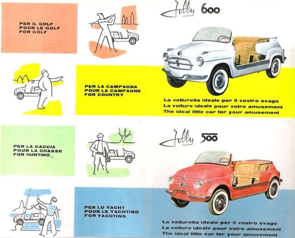 Popularizada por veículos como o Citroën Méhari, ou o Mini Moke, a categoria dos automóveis de praia é antes de mais uma criação italiana. Nascido nos finais dos anos 50, diz a lenda que o primeiro Fiat Jolly foi uma encomenda pessoal do então patrão da Fiat, Gianni Agnelli ao carroçador Ghia. ‘L’avvocato’ queria um pequeno cabriolet, para as suas deslocações quotidianas durante as férias, entre a sua villa na Riviera Francesa e o seu iate ancorado no porto de recreio.